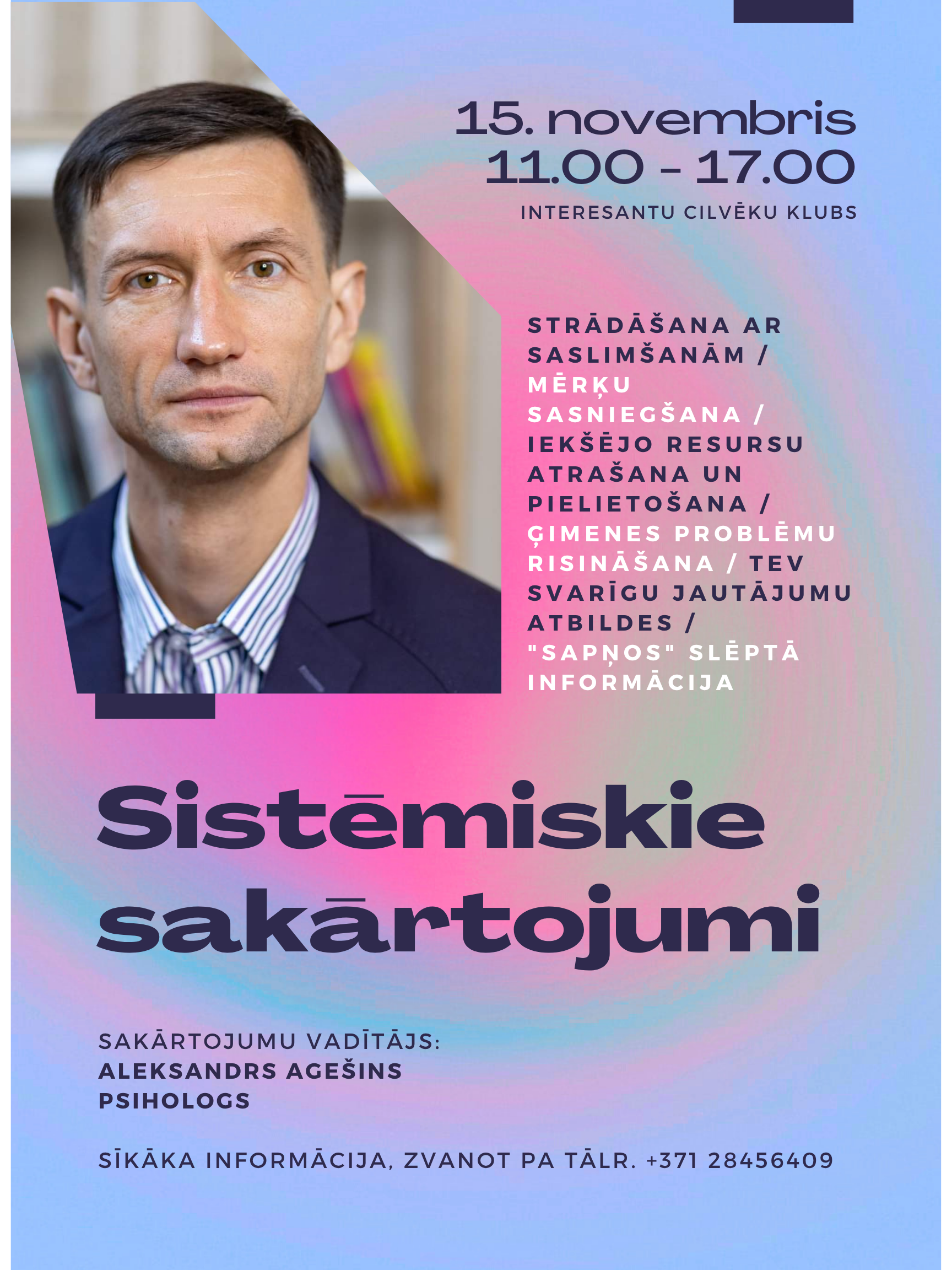 Sakārtojumu vadītājs: psihologs Aleksandrs Agešins – profesionālis ar pieredzi darbā ar cilvēku iekšējām sistēmām un neredzamajiem procesiem.