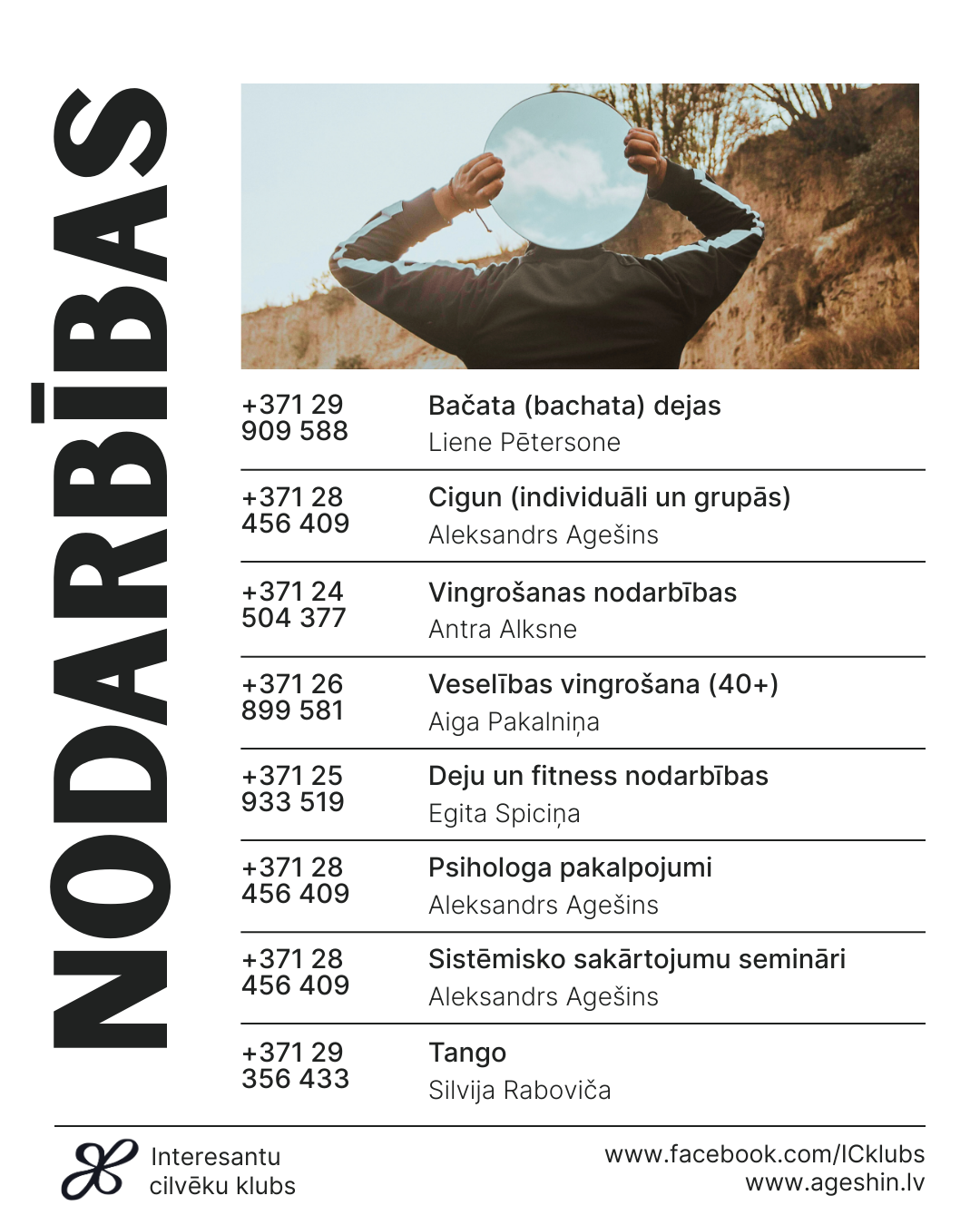 Šīs ir regulāras nodarbības, kuras vada savas jomas lietpratēji un meistari. Par dienām, laikiem, cenām un pieteikšanos droši sazinies tieši ar nodarbību vadītājiem (kontakti redzami vizuālajā plakātā).