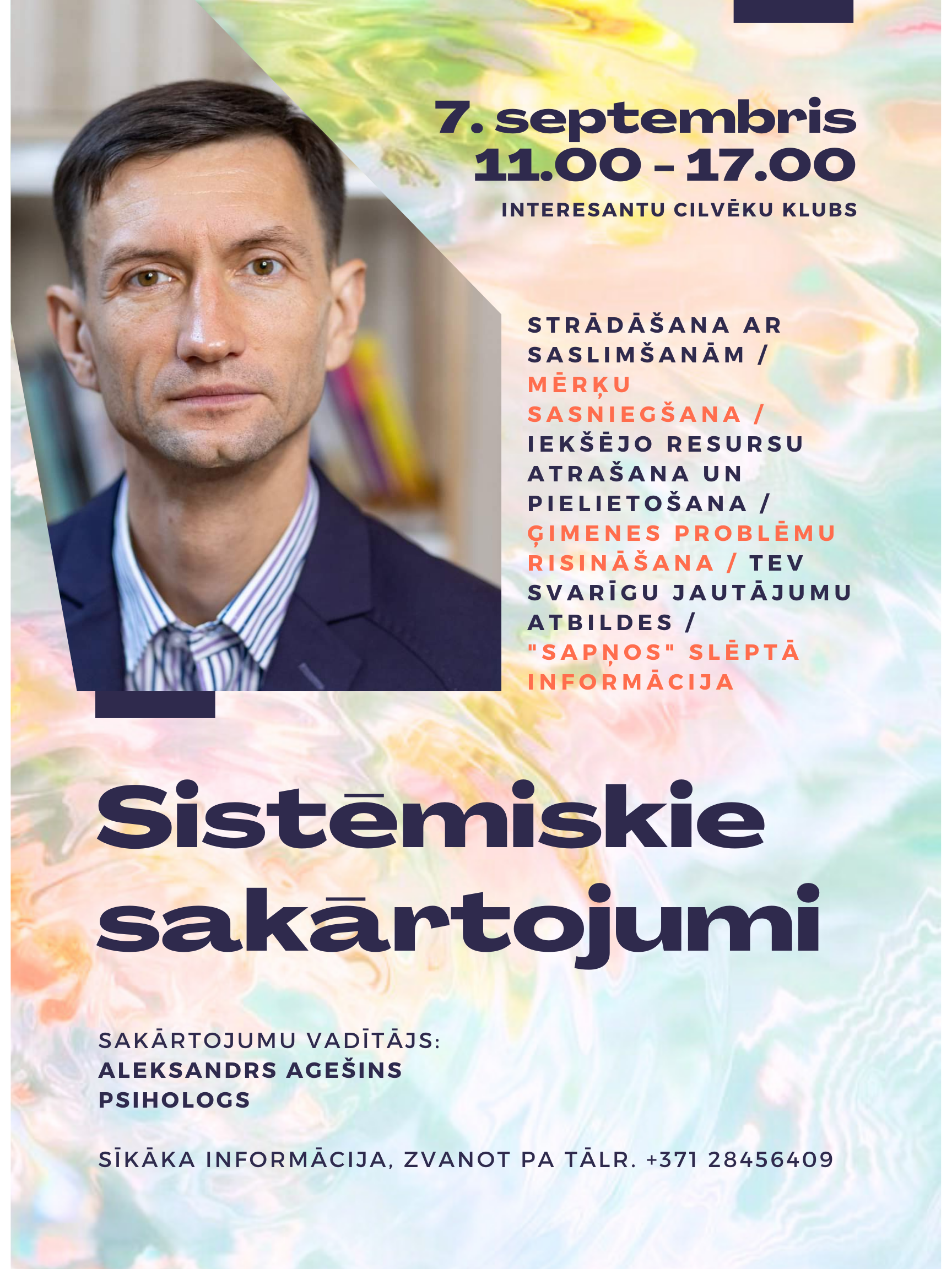 7. septembrī plkst. 11.00–17.00 Interesantu cilvēku klubā aicinām uz Sistēmiskajiem sakārtojumiem kopā ar psihologu Aleksandru Agešinu.